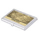 Design features random layers of music notes, lines, and staffs trimmed by a coordinating golden banner. Personalized business card case provides space for a name or any other text of your choice.