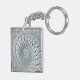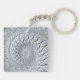 This monochrome keychain features an abstract spiral fractal design in light gray and black.