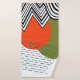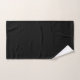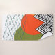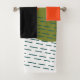 This towel set has an orange washcloth, a black hand towel, and a bath towel with a mid-century modern design of curvy and zigzag lines in black, circles in yellow, orange, and green, and a rectangle made from dashed teal lines. If you want the same design with different colors, message me.