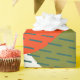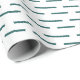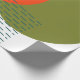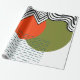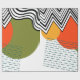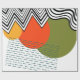 This wrapping paper has a mid-century modern design of curvy and zigzag lines in black, circles in yellow, orange, and green, and a rectangle made from dashed teal lines.