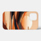 A minimalist, abstract landscape in shades of red-orange, brown, and tan with hills, a river, and an enormous setting sun creates a beautiful phone case.