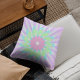 The design of this pillow features psychedelic geometric petals in mint and pink, creating a vibrant pastel, feminine, and symmetrical floral effect. Its playful style adds a chic, bright energy to your room.