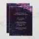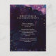 Artistic and chic wedding insert cards featuring abstract watercolor paint strokes in purple and blue with gold dots and simple modern text on a dark black background. Perfect for chic modern art museum and art gallery weddings.