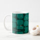 Abstract modish shapes, personalized holiday mug. Festive shades of green and faux gold specs with template text line for name or initials.