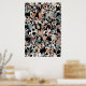 An abstract interpretation of a camouflage design in a color palette of brown, black, gray, beige, taupe and green.