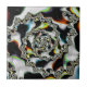 This ceramic tile features an abstract, psychedelic spiral fractal art in black and white with yellow, orange, blue, and green accents.
