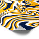 This abstract design features a dynamic interplay of flowing, wavy lines that create a sense of movement and fluidity. The dominant warm orange brings energy and vibrancy to the composition, while the deep navy blue provides a striking contrast. White accents help balance the colors, adding clarity and definition to the intricate patterns.