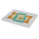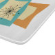 This funky mid century modern cutting board features squeezed and stretched rectangle shapes, and highlighted with a starburst, in the colors turquoise, orange, and cream. This will make a fabulous addition to your kitchen!