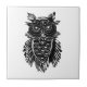 a decorative black and white design of a little owl featuring lots of ornamental patterns and elements on its feathers.