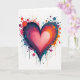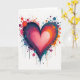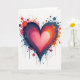 This greeting card features a large heart in the center, painted with layered colors that shift from soft pink in the middle to fuchsia and deep magenta, then out to orange, red, and touches of blue along the edge. The heart has visible brush marks that make it look textured and full of feeling. Around it, splatters and drips of paint spread across the white background, with dots and streaks in orange, red, teal, and blue. Some of the paint runs downward in thin lines, like the color is still moving. The overall look feels romantic and heartfelt, like a big burst of affection that’s hard to hold back ❤️💌🍫.