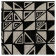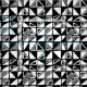 An original hand drawn continuous pattern made up of an irregular grid of squares each divided diagonally in random ways creating triangles some shaded, some unshaded with some further decorated.