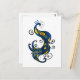 decorative artwork of an abstract stylized peacock with lots of ornamental elements in blue, yellow and green colors on a postcard.