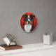 Make a striking statement in your space with this bold red circle dog wall clock featuring an expressive abstract dog face with unique black, brown, and white markings and captivating orange eyes. The vivid red circular background enhances the intensity of the design, creating a modern and artistic focal point for any room.