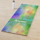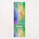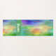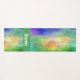 Custom yoga mat done in a colorful yellow, green, blue and pink plasma cloud design, with a green band, across one end, with custom white text. Same design is featured on both the front and backside of the mat.