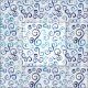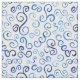 S curves, U's, and other scrolling shapes on a white background are reproduced in this fun blue on white abstract pattern.