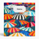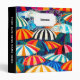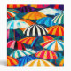 A cheerful depiction of sun-soaked days and seaside relaxation with colorful striped beach umbrellas.