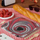 This product features beautiful spiral fractal art in red, black, gray and white.