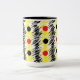 Abstract Scribble Polka Dot Pattern Two-Tone Coffee Mug designed by Nisha Prabhu CuteHomeGifts. Colorful abstract pattern featuring black vertical stripe scribble and black red color polka dot on yellow background.
