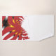 An abstract art design of a mythical creature reminiscent of a sea anemone, in red, yellow, white and gold.
