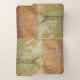 The background of this Jennifer Goldberger painting looks like a table with a forked crack in it. There is also an abstract silhouette of a flower done in white paint, just barely overriding the brown background.