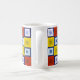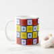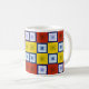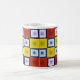 Acrylic painted abstract design in bright hues of yellows, oranges, blues, and purples. A cup of java that will surely wake you up!