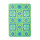 Bath mat in a geometric abstract star pattern In shades of lime green, cerulean blue and turquoise, accented with deep blue