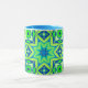 Coffee mug in a geometric abstract star pattern In shades of lime green, cerulean blue and turquoise, accented with deep blue