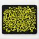 A mouse pad with an quirky hand drawn abstract surreal design, a network of shapes link together with wire like shapes which looks both natural and machine like.
