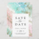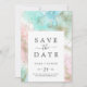 This abstract summer save the date announcement card is perfect for a modern wedding. The unique elegant design features light blue, mint green, blush pink and pastel purple watercolor with splashes of gold glitter, creating a whimsical beachy feel.