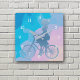 Modern abstract meets retro Americana in this unique and colorful clock. It features a slate blue silhouette image of a girl riding a bicycle.The image is placed on a colorful abstract background in tones of blue, cerulean, lavender, and pink. The background looks like an abstract sunrise.