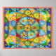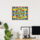 Vibrant geometric patterns fill the image, featuring circles, triangles, and swirls in a kaleidoscope of colors including blue, green, yellow, and red. The intricate design creates a sense of symmetry and balance.