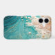 This image presents an abstract, topographic-style depiction of an ocean landscape. The left side features swirling patterns in shades of blue and turquoise, resembling deep water currents. Moving towards the right, the colors transition to warmer tones of beige and light brown, suggesting a sandy shoreline.