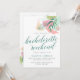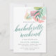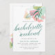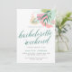 A modern invitation perfect for a bachelorette weekend celebration at the beach. This design feature tropical leaves ans abstract shapes in greens, pinks and coral on a white background. "bachelorette weekend" and the name of the bride-to-be are in teal green. The reverse includes an Itinerary of the weekend.