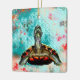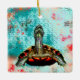 A hand drawn depiction of a turtle with an abstract background. Colors used: red, blue, teal, green, yellow, purple.