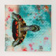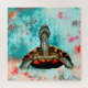 A hand drawn depiction of a turtle with an abstract background. Colors used: red, blue, teal, green, yellow, purple.
