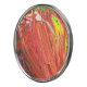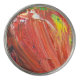 Rich reds dominate the surface, balanced by warm earth tones and flashes of green, creating depth and visual tension.
