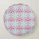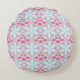 Round pillow with an abstract water lily design. Pattern of flowers and swirls in soft blue and grapefruit pink.