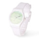 I only have one complaint. I ordered the watch with clear case and strap, and what was sent was white case and strap. I'm going to keep it because 1) it looks very nice in white, and 2) it would take too long to get a replacement made and sent in time for my occasion. Aside from the mix up with the color, the watch does look very good in white. The purple dial is actually sparkly which did not show in the online images. That was a nice surprise. If you like Swatch watches this is very similar to those. It's 33.6mm in diameter, 10.5mm thick, and 40.6mm lug to lug. Stainless steel case back says 3ATM/30m WR, so no swimming or showering or submerging this one. If you like Woodstock, this is a great choice.