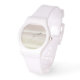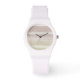 I only have one complaint. I ordered the watch with clear case and strap, and what was sent was white case and strap. I'm going to keep it because 1) it looks very nice in white, and 2) it would take too long to get a replacement made and sent in time for my occasion. Aside from the mix up with the color, the watch does look very good in white. The purple dial is actually sparkly which did not show in the online images. That was a nice surprise. If you like Swatch watches this is very similar to those. It's 33.6mm in diameter, 10.5mm thick, and 40.6mm lug to lug. Stainless steel case back says 3ATM/30m WR, so no swimming or showering or submerging this one. If you like Woodstock, this is a great choice.