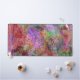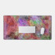 This desk mat has an abstract design with a watercolor paint look of greens, pink, yellows, and purple swirled together with grey squiggle lines.
