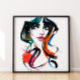 The image is a watercolor portrait of a stylized woman's face, characterized by vibrant colors and bold, abstract strokes that convey a sense of dynamism and movement. Her features are elegantly highlighted by the interplay of colors, with her eyes and lips rendered expressively, adding to the piece's captivating allure. The artwork's fluidity and the way the shades blend create an ethereal effect. This striking piece would fit well in a variety of spaces that appreciate contemporary art, such as beauty salons, chic restaurants, hair salons or creative workspaces. Its lively yet sophisticated style makes it ideal for places designed with a sense of artistic flair and would serve as an excellent conversation starter in commercial settings that aim to create an inspiring and thought-provoking environment.