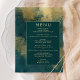 This elegant wedding menu features a modern teal blue and gold abstract watercolor background. Customize the gold-colored text in stylish fonts on a dark teal rectangle. The back of the menu repeats the abstract design.