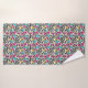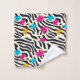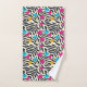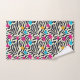 This vibrant bath towel features a dynamic fusion of bold black and white zebra-like stripes overlaid with colorful paint splashes in the shapes of autumn leaves. The striking contrast between the monochrome background and the vivid hues of red, orange, and yellow creates a visually captivating pattern. Ideal for various creative applications, this design brings together the wild essence of animal prints with the warm tones of fall foliage.