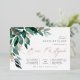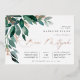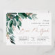 Elegant b'nai mitzvah invitation features watercolor eucalyptus leaves and green foliage cascading from the upper left corner, embellished with rose gold foil accents. Personalize with your temple ceremony and celebration details aligned at the right. Cards reverse to solid forest green.