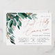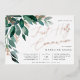Elegant first holy communion invitation for your little girl features watercolor eucalyptus leaves and green foliage cascading from the upper left corner, embellished with rose gold foil accents. Personalize with your Communion ceremony and celebration details aligned at the right. Cards reverse to solid forest green.
