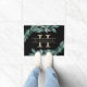 Elegant botanical doormat in rich black features your single initial monogram with your family name overlaid, framed by watercolor leaves and foliage in rich shades of green.