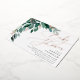 Elegant gender neutral baby shower invitation features watercolor eucalyptus leaves and green foliage cascading from the upper left corner, embellished with rose gold foil accents. Personalize with your baby shower details aligned at the right. Cards reverse to solid forest green.