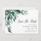 Elegant botanical save the date cards feature lush watercolor eucalyptus leaves and green foliage cascading from the upper left corner. Customize with your names, wedding date, location and wedding website or invitation info, beneath "save the date" in chic calligraphy script. Cards reverse to solid forest green.