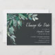 Chic botanical wedding postponement announcement features lush green eucalyptus leaves illustrated in watercolor. Personalize with your wedding details aligned at the right in a mix of traditional block and modern calligraphy typefaces on a rich off-black background. Cards reverse to solid forest green.