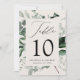 Elegant, botanical wedding table cards featuring the table number, your names, and wedding date nestled in a rectangular frame surrounded by eucalyptus, ferns, and other rich greenery with a cream background. Personalize the number for each table card and add it to your cart. The 5x7 table cards were designed to coordinate with our Abundant Greenery wedding collection.
